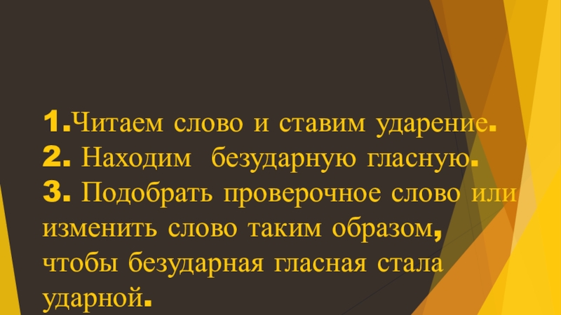 Слайд 121.Читаем слово и ставим ударение. 2. Находим безударную гласную. 3. Подобрать проверочное слово