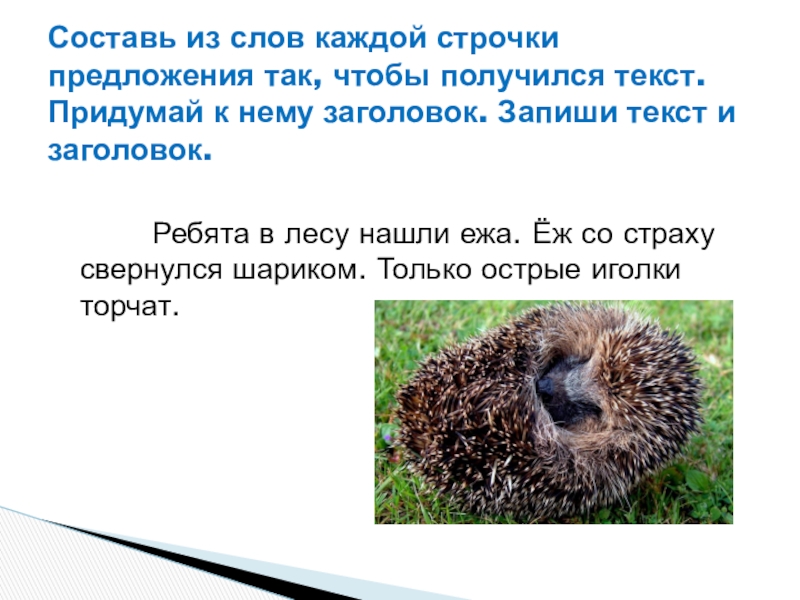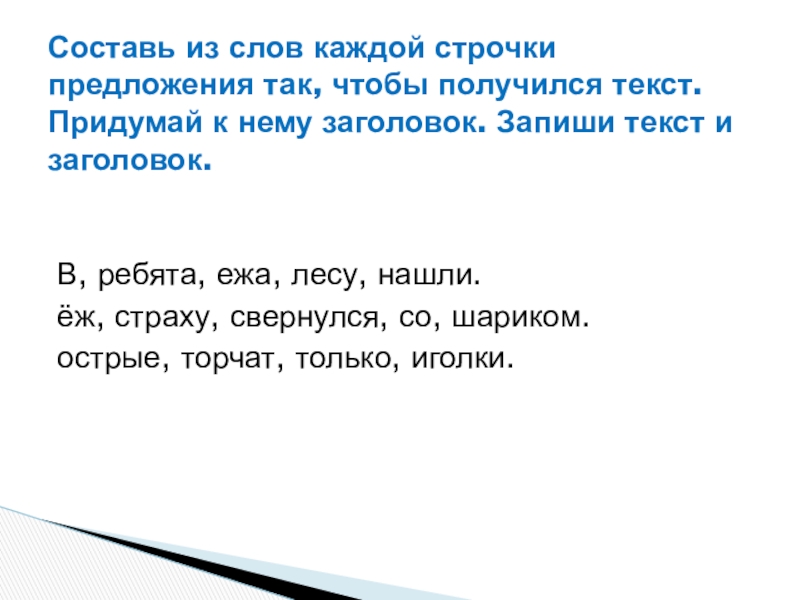 Составь из слов каждой строчки предложения так, чтобы получился текст. Придумай к нему заголовок. Запиши текст и заголовок.