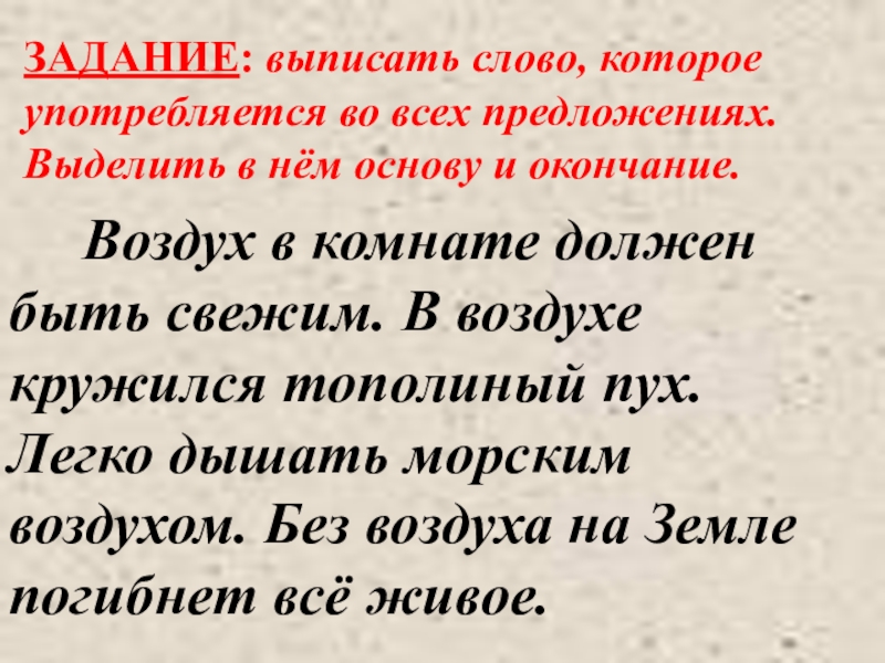 Воздух в комнате должен быть свежим. В воздухе кружился тополиный пух. Легко дышать морским воздухом. Без воздуха на Земле погибнет всё живое.