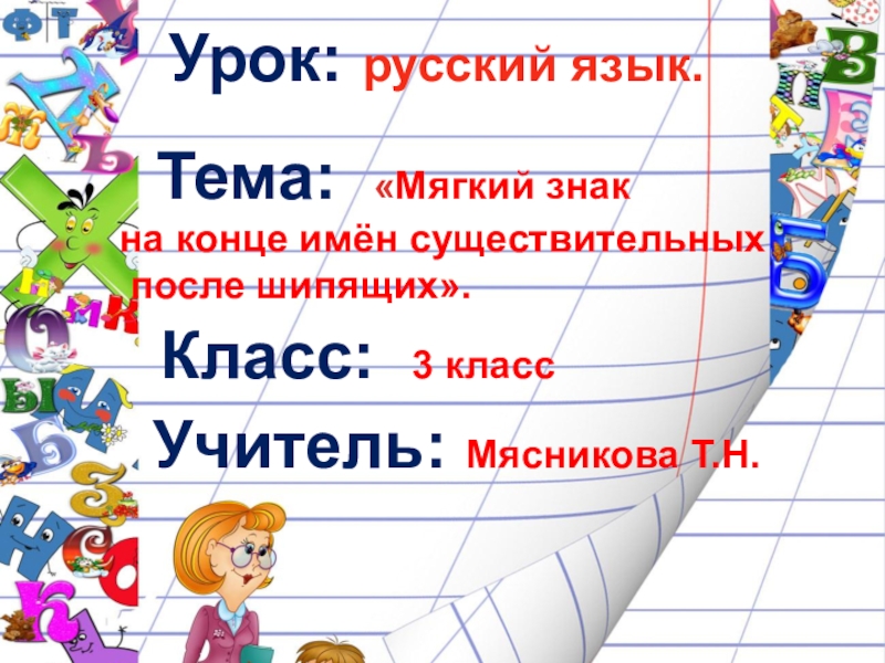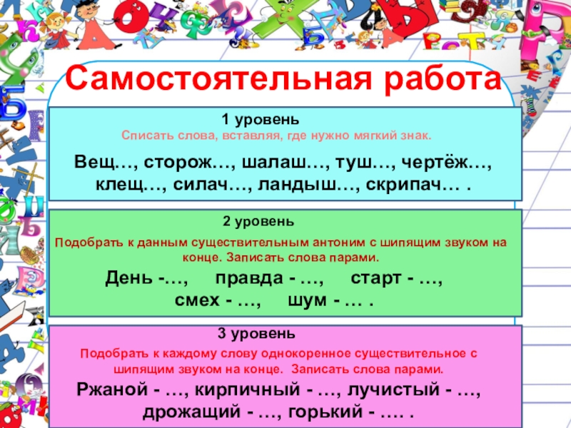 Вещ…, сторож…, шалаш…, туш…, чертёж…, клещ…, силач…, ландыш…, скрипач… .