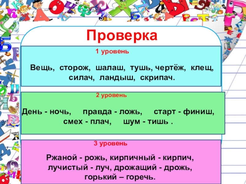 Вещь, сторож, шалаш, тушь, чертёж, клещ, силач, ландыш, скрипач.