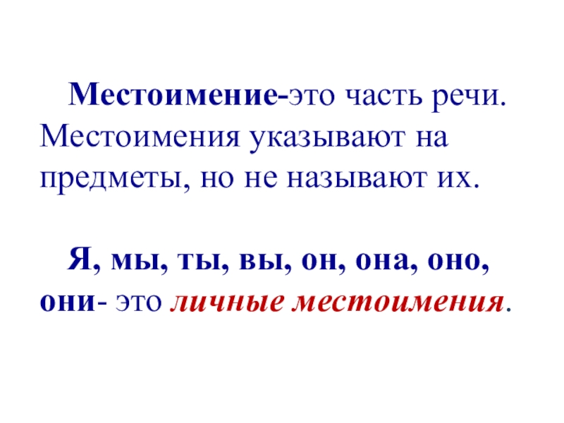 Слайд 21Местоимение-это часть речи. Местоимения указывают на предметы, но не называют их.