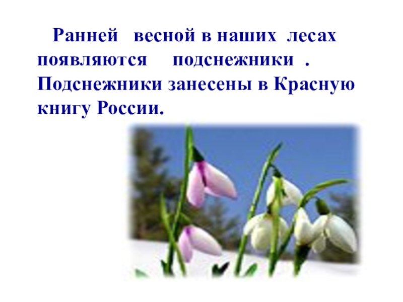 Слайд 11 Ранней весной в наших лесах появляются подснежники. Они занесены в