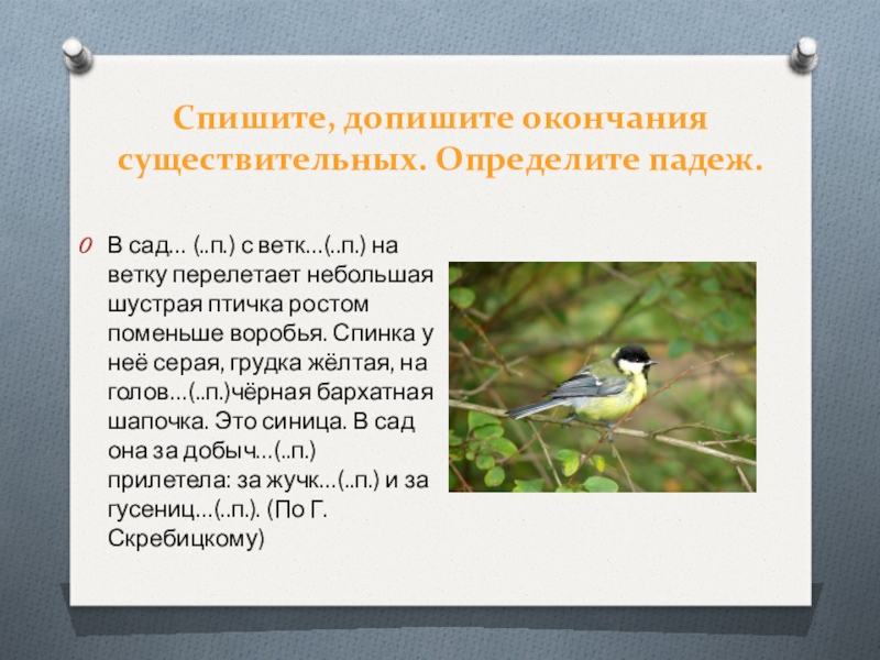ветку перелетает небольшая шустрая птичка ростом поменьше воробья. Спинка у неё серая, грудка жёлтая, на голов…(..п.)чёрная бархатная шапочка. Это синица. В сад она за добыч…(..п.) прилетела: за жучк…(..п.) и за гусениц…(..п.). (По Г.Скребицкому)
