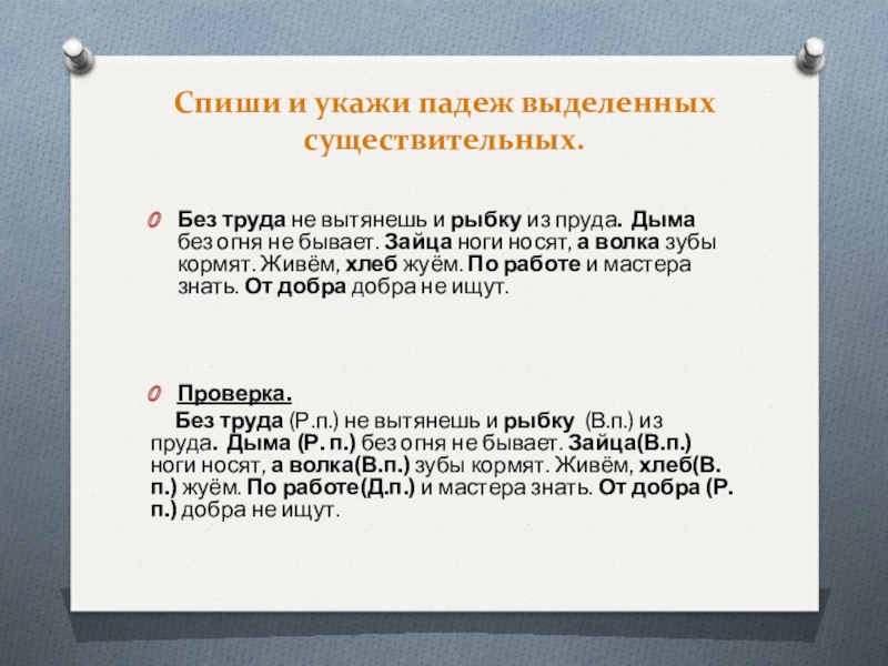 Без труда (Р.п.) не вытянешь и рыбку (В.п.) из пруда. Дыма (Р. п.) без огня не бывает. Зайца(В.п.) ноги носят, а волка(В.п.) зубы кормят. Живём, хлеб(В.п.) жуём. По работе(Д.п.) и мастера знать. От добра (Р.п.) добра не ищут.