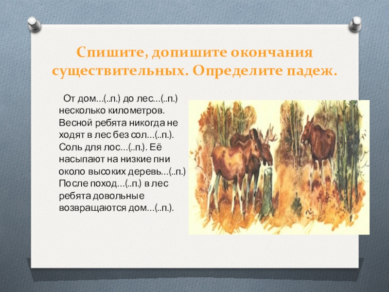 километров. Весной ребята никогда не ходят в лес без сол…(..п.). Соль для лос…(..п.). Её насыпают на низкие пни около высоких деревь…(..п.) После поход…(..п.) в лес ребята довольные возвращаются дом…(..п.).