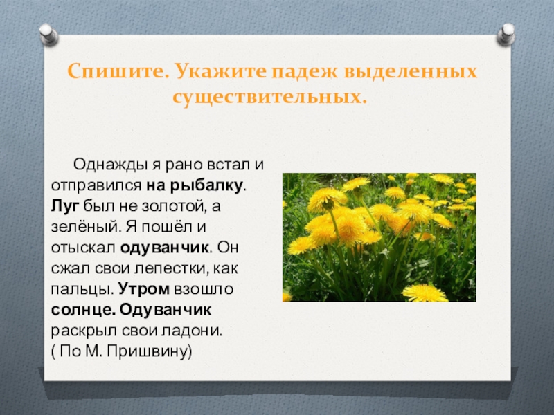 и отправился на рыбалку. Луг был не золотой, а зелёный. Я пошёл и отыскал одуванчик. Он сжал свои лепестки, как пальцы. Утром взошло солнце. Одуванчик раскрыл свои ладони. ( По М. Пришвину)
