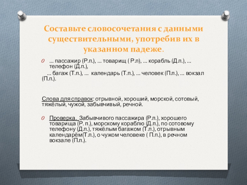 Проверка. Забывчивого пассажира (Р.п.), хорошего товарища (Р. п.), морскому кораблю (Д.п.), по сотовому телефону (Д.п.), тяжёлым багажом (Т.п.), отрывным календарём(Т.п.), о чужом человеке ( П.п.), в речном вокзале (П.п.).