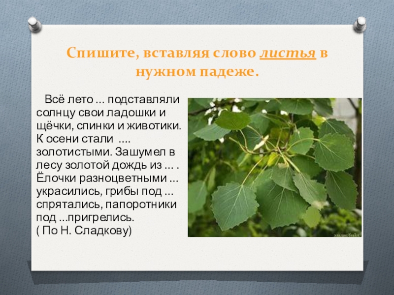 Слайд 8Спишите, вставляя слово листья в нужном падеже.
