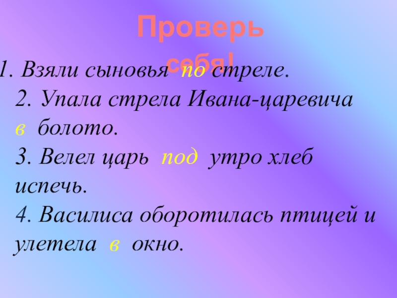 Ивана-царевича (в) болото. 3. Велел царь (под) утро хлеб испечь.