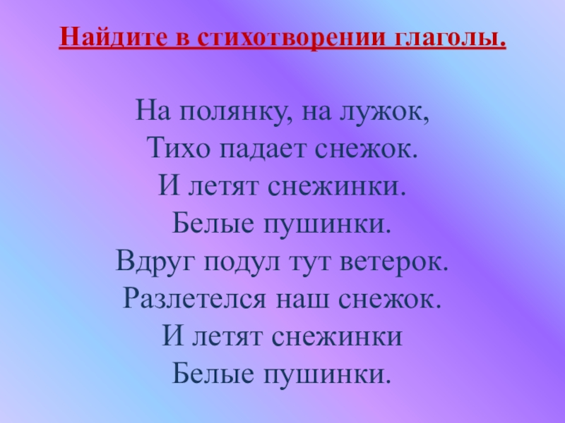 Найдите в стихотворении глаголы.На полянку, на лужок,Тихо падает снежок.И летят снежинки.Белые пушинки.Вдруг подул тут ветерок.Разлетелся наш снежок.И