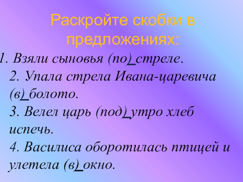 Раскройте скобки в предложениях: Взяли сыновья (по) стреле.2. Упала стрела Ивана-царевича (в) болото.