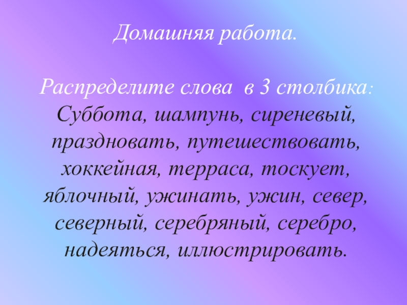 Домашняя работа.Распределите слова в 3 столбика:Суббота, шампунь, сиреневый, праздновать, путешествовать, хоккейная, терраса, тоскует, яблочный, ужинать, ужин, север,