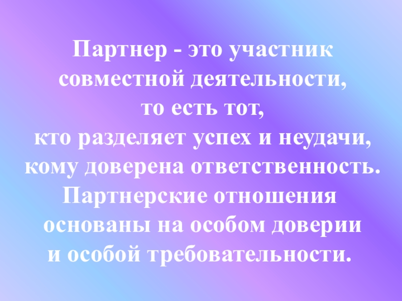 Партнер - это участник совместной деятельности, то есть тот, кто разделяет успех и неудачи, кому доверена