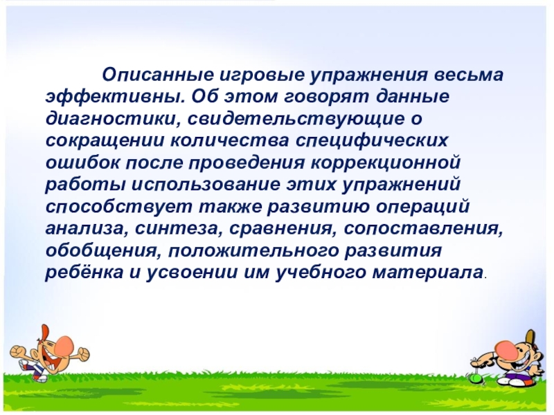 о сокращении количества специфических ошибок после проведения коррекционной работы использование этих упражнений способствует также развитию операций анализа, синтеза, сравнения, сопоставления, обобщения, положительного развития ребёнка и усвоении им учебного материала.