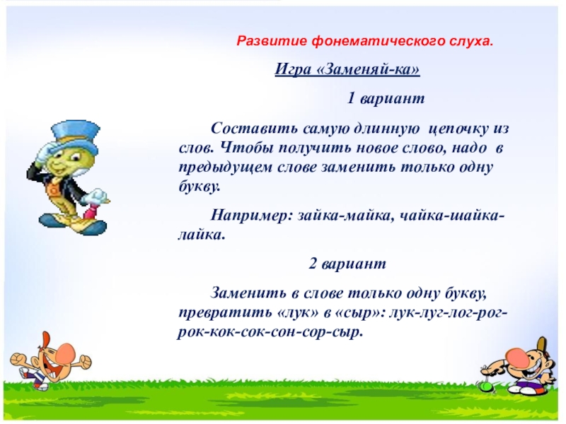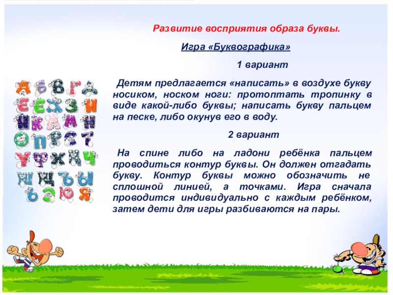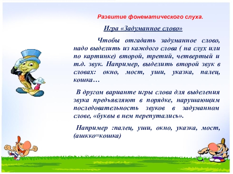 В другом варианте игры слова для выделения звука предъявляют в порядке, нарушающим последовательность звуков в задуманном слове, «буквы в нем перепутались».