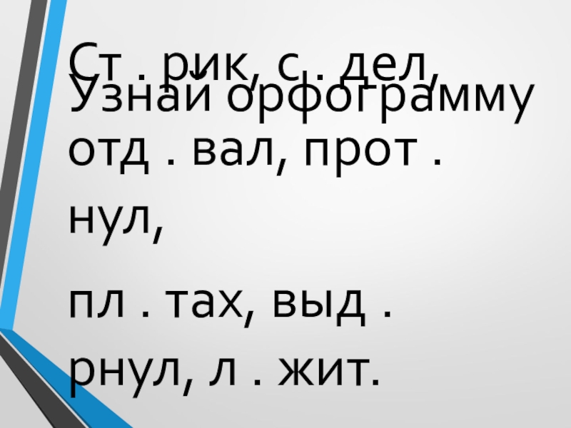 Узнай орфограммуСт . рик, с . дел, отд . вал, прот .нул, пл . тах, выд .