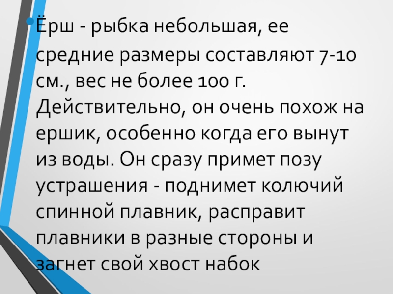 Слайд 5Ёрш - рыбка небольшая, ее средние размеры составляют 7-10 см., вес