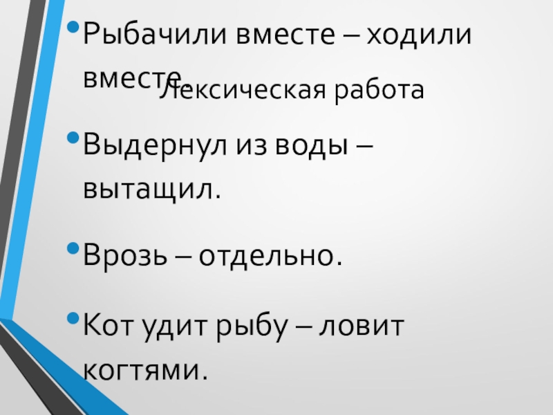Лексическая работаРыбачили вместе – ходили вместе.Выдернул из воды – вытащил.Врозь – отдельно.Кот удит рыбу – ловит когтями.Старик