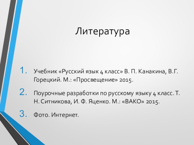 Литература Учебник «Русский язык 4 класс» В. П. Канакина, В.Г. Горецкий. М.: «Просвещение» 2015.Поурочные разработки по русскому