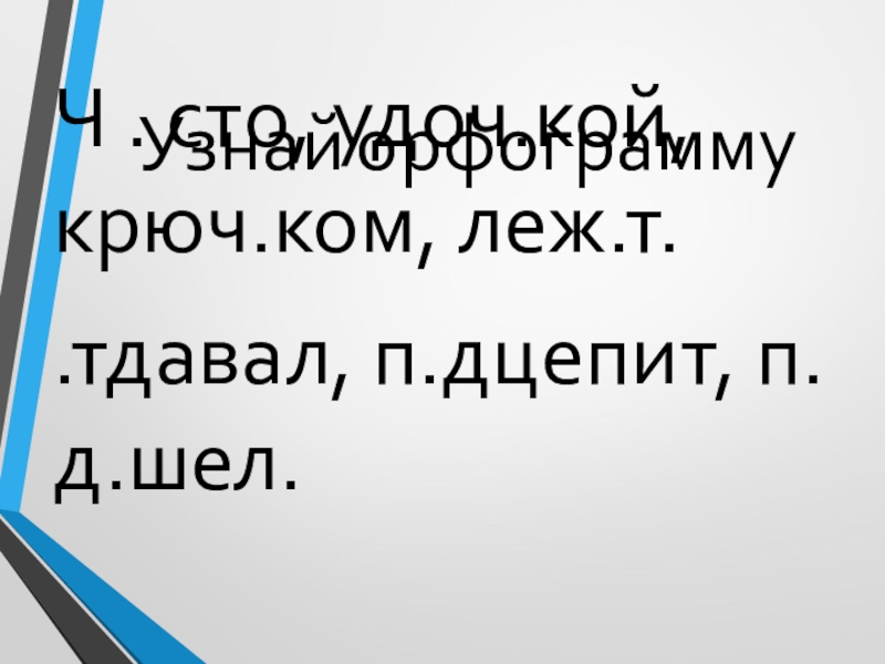 Узнай орфограммуЧ . сто, удоч.кой, крюч.ком, леж.т..тдавал, п.дцепит, п.д.шел.