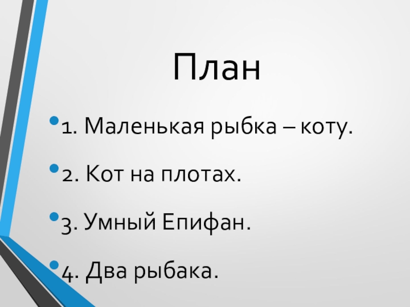 План 1. Маленькая рыбка – коту.2. Кот на плотах.3. Умный Епифан.4. Два рыбака.