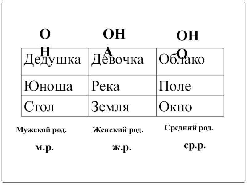 ОНОНАОНОМужской род.м.р.Женский род.ж.р.Средний род.ср.р.