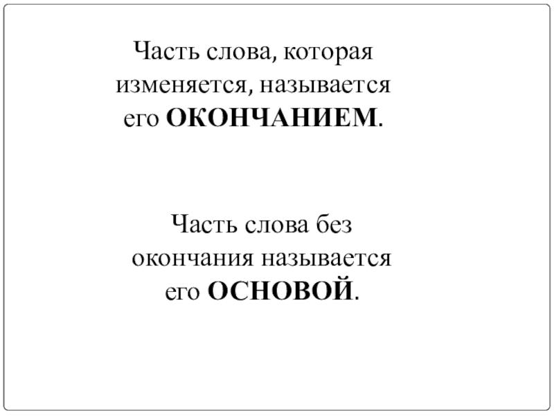 Часть слова, которая изменяется, называется его ОКОНЧАНИЕМ.Часть слова без окончания называется его ОСНОВОЙ.