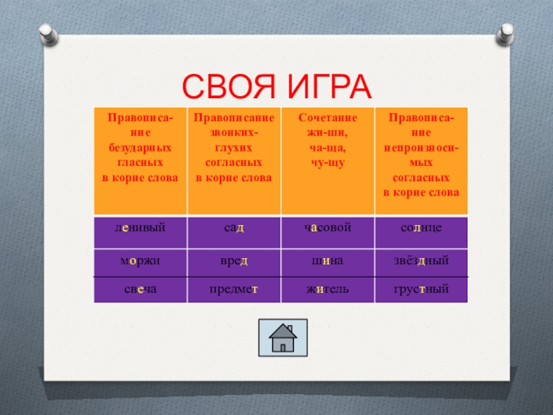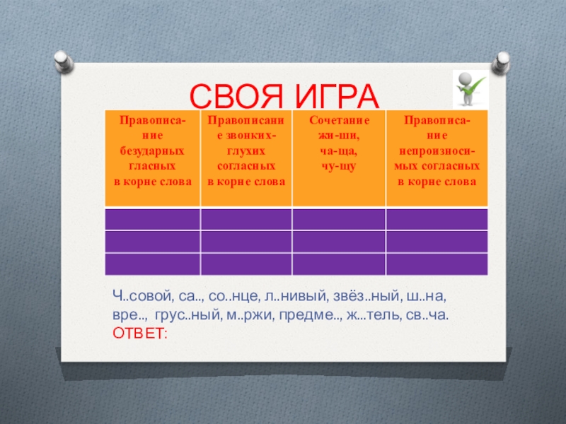 СВОЯ ИГРАЧ..совой, са.., со..нце, л..нивый, звёз..ный, ш..на, вре.., грус..ный, м..ржи, предме.., ж...тель, св..ча.