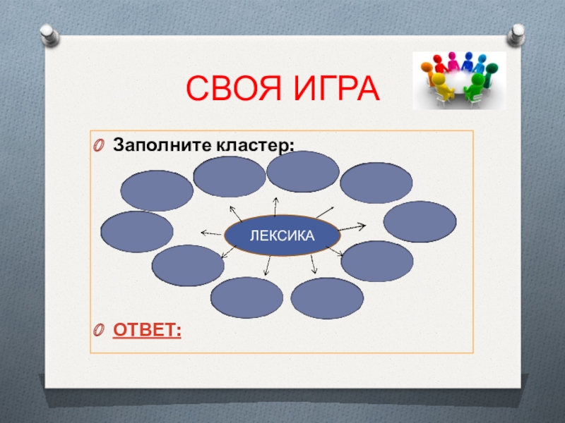 СВОЯ ИГРАЗаполните кластер:ОТВЕТ:ЛЕКСИКА