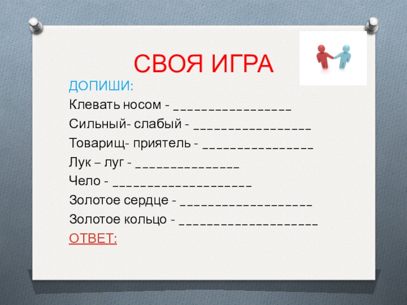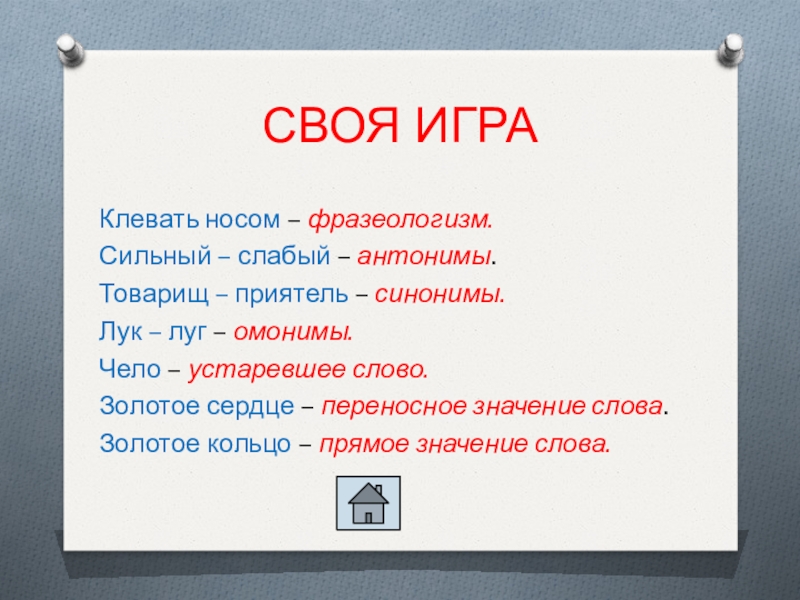 СВОЯ ИГРАКлевать носом – фразеологизм.Сильный – слабый – антонимы.Товарищ – приятель – синонимы.Лук – луг – омонимы.Чело