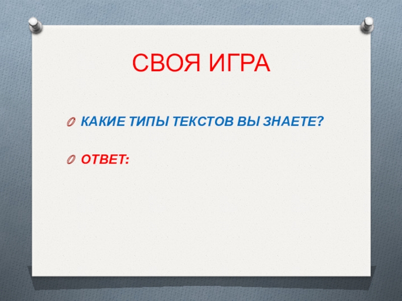 СВОЯ ИГРАКАКИЕ ТИПЫ ТЕКСТОВ ВЫ ЗНАЕТЕ?ОТВЕТ: