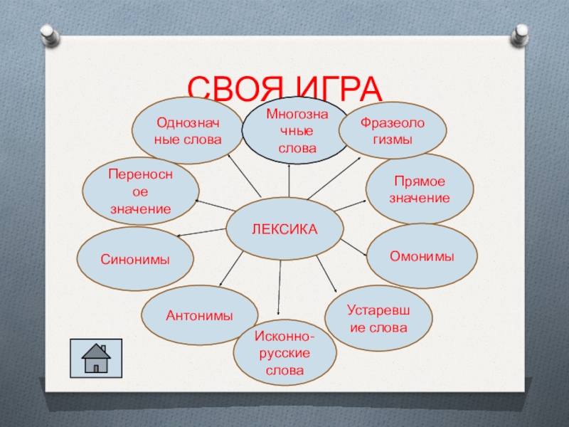 СВОЯ ИГРАОднозначные словаМногозначные словаПрямое значениеПереносное значениеСинонимыАнтонимыОмонимыУстаревшие словаИсконно-русские словаЛЕКСИКАФразеологизмы