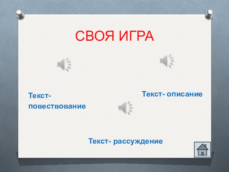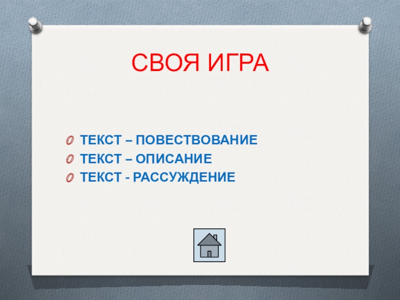 СВОЯ ИГРАТекст- повествованиеТекст- описаниеТекст- рассуждение