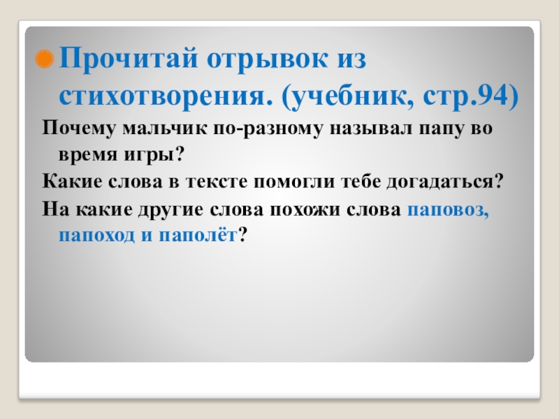 Прочитай отрывок из стихотворения. (учебник, стр.94)Почему мальчик по-разному называл папу во время игры?Какие слова в тексте помогли