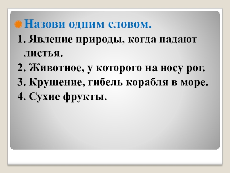 Назови одним словом. 1. Явление природы, когда падают листья.2. Животное, у которого на носу рог.3. Крушение, гибель