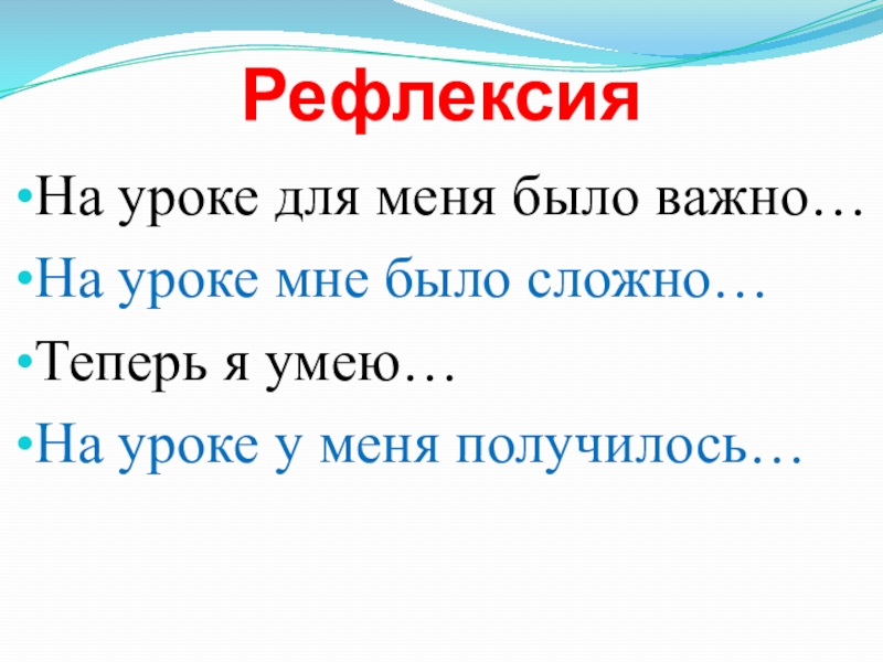 РефлексияНа уроке для меня было важно…На уроке мне было сложно…Теперь я умею…На уроке у меня получилось…