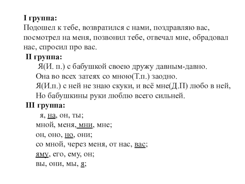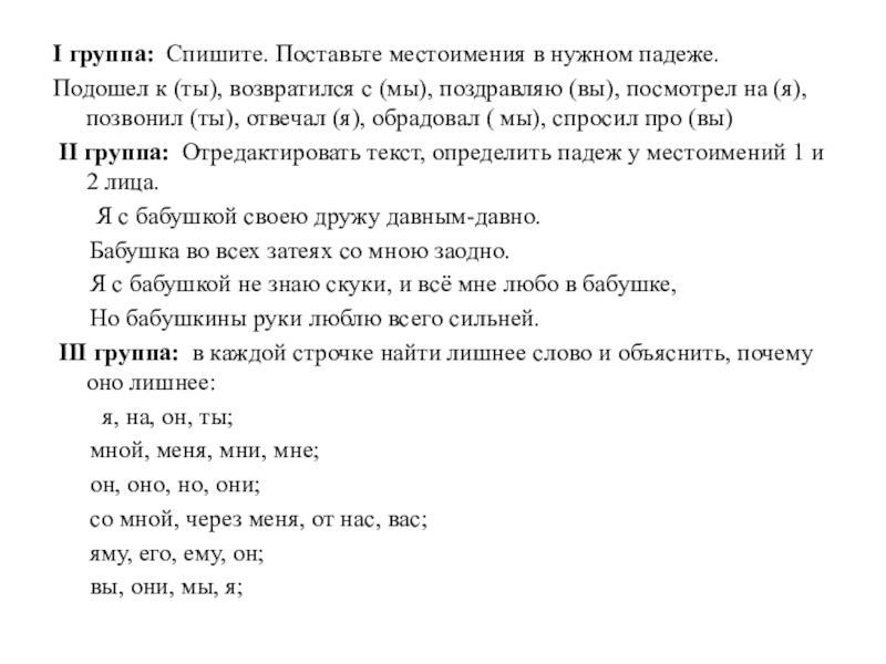 II группа: Отредактировать текст, определить падеж у местоимений 1 и 2 лица.