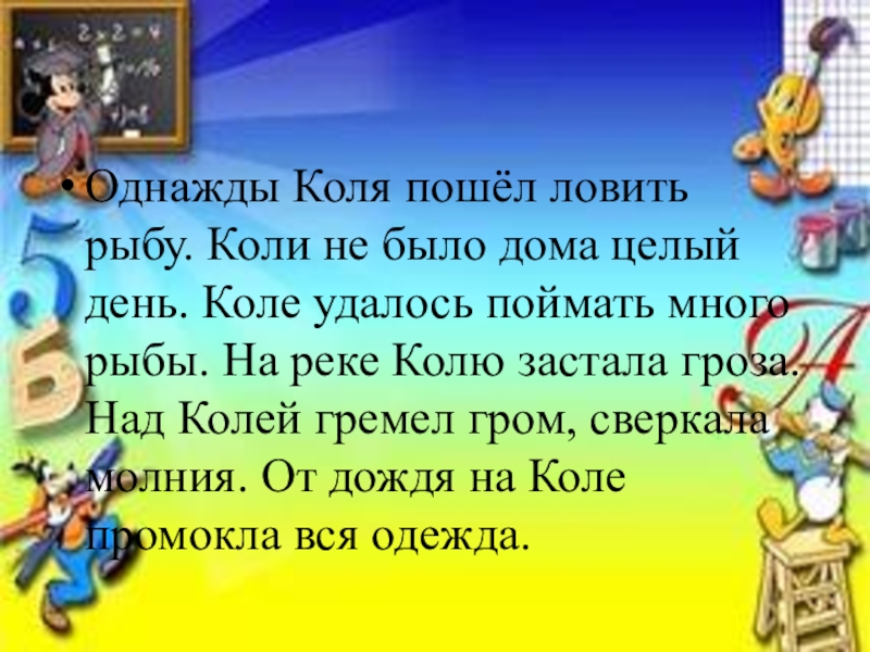 Коле удалось поймать много рыбы. На реке Колю застала гроза. Над Колей гремел гром, сверкала молния. От дождя на Коле промокла вся одежда.