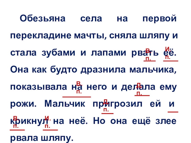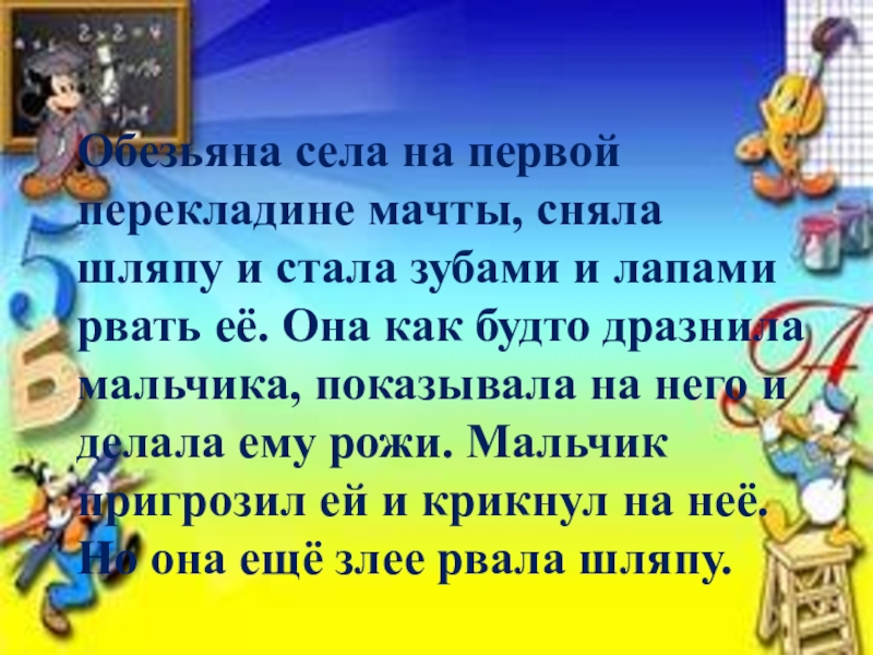 Слайд 7Обезьяна села на первой перекладине мачты, сняла шляпу и стала зубами