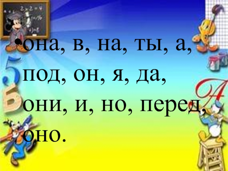 Слайд 3она, в, на, ты, а, под, он, я, да, они, и,