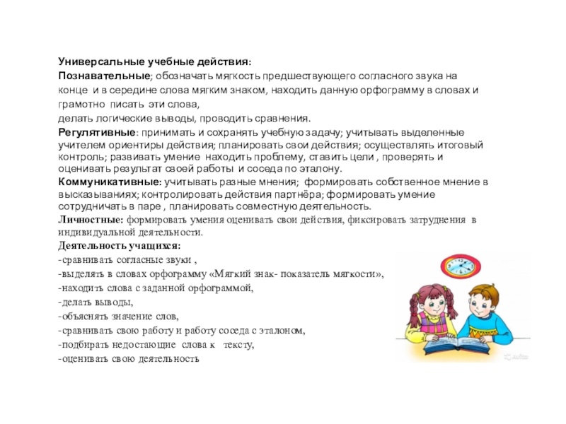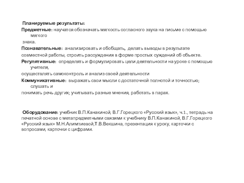 Предметные: научатся обозначать мягкость согласного звука на письме с помощью мягкого