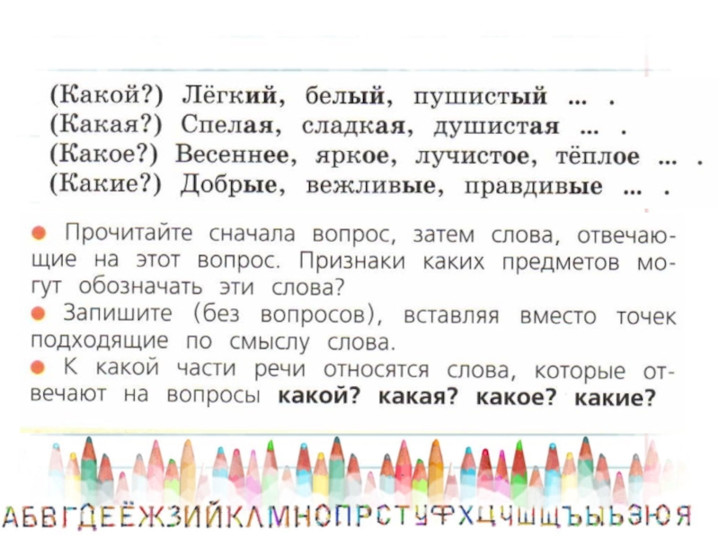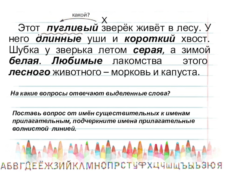 Поставь вопрос от имён существительных к именам прилагательным, подчеркните имена прилагательные волнистой линией.