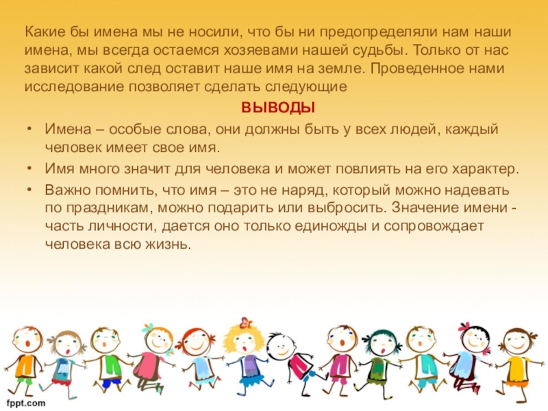 наши имена, мы всегда остаемся хозяевами нашей судьбы. Только от нас зависит какой след оставит наше имя на земле. Проведенное нами исследование позволяет сделать следующие