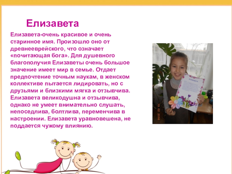 что означает «почитающая бога». Для душевного благополучия Елизаветы очень большое значение имеет мир в семье. Отдает предпочтение точным наукам, в женском коллективе пытается лидировать, но с друзьями и близкими мягка и отзывчива. Елизавета великодушна и отзывчива, однако не умеет внимательно слушать, непоседлива, болтлива, переменчива в настроении. Елизавета уравновешена, не поддается чужому влиянию.