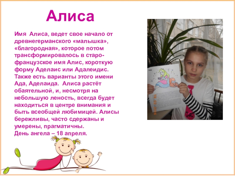 трансформировалось в старо-французское имя Алис, короткую форму Аделаис или Адалеидис. Также есть варианты этого имени Ада, Аделаида. Алиса растёт обаятельной, и, несмотря на небольшую леность, всегда будет находиться в центре внимания и быть всеобщей любимицей. Алисы бережливы, часто сдержаны и умерены, прагматичны.