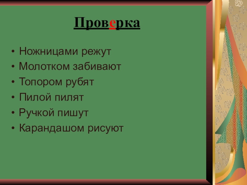 Проверка Ножницами режутМолотком забиваютТопором рубятПилой пилятРучкой пишутКарандашом рисуют