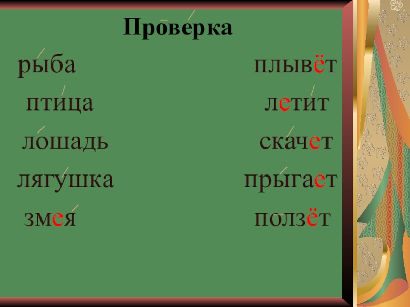 Проверкарыба                          плывётптица                         летитлошадь                      скачетлягушка                   прыгаетзмея                          ползёт