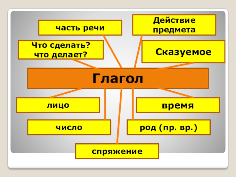 ГлаголЧто сделать? что делает?часть речиДействие предметаСказуемоелицочислоспряжениевремярод (пр. вр.)