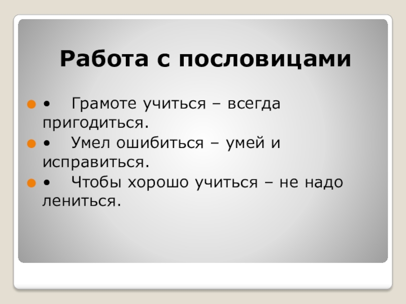 Работа с пословицами•	Грамоте учиться – всегда пригодиться.•	Умел ошибиться – умей и исправиться.•	Чтобы хорошо учиться – не надо